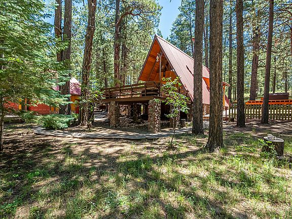 The Best Lot in Forest Lakes & The Cabin With Everything! This very special 1.06 acre property is tucked away at the end of a private cul-de-sac and adjoins the Sitgreaves National Forest. With an amazing 370' of forest frontage this is one of the most coveted lots in Forest Lakes. A custom Cabin with a big 2-story detached garage with guest quarters and an extra bathroom and laundry checks all the boxes. This custom A-frame cabin in the cool Ponderosa Pines is special. The main cabin is the perfect place to gather with friends and family offering a private bedroom (king bed), guest loft (3 queen beds), and the recently renovated bathroom and a full size laundry suite. Also in the main cabin is a full kitchen, spacious dining area and cozy living room with a wood burning stove... Need more space? The guest quarters above the garage (2 king beds) has a private entrance and plenty of room to play and sleep extra guests. The garage also includes a secondary bathroom and a second full size laundry suite.