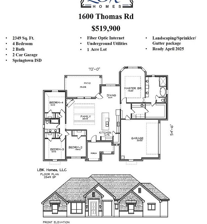 Charming LBK Home on 1 acre tract in Springtown ISD. This 2349 sq ft home has 4 bedrooms and 2 full bathrooms. This home has an open floor plan with split bedrooms. Large kitchen with ample cabinet space, large eat at island, quartz countertops, decorative light fixtures, and under mount lighting.Large living room has a ceilings with beams, stone fireplace, large windows allowing great nature light. Large primary bedroom with primary bathroom boasting double vanities, separate shower and tub, and large walk in closet. Nice sized spare bedrooms with large closets. This homes has a 2 car garage with side entry and covered back patio. LBK Homes has all exterior walls spray foamed and CAT 6 hardwiring to all rooms for tv and streaming. BUILDER OFFERING $20,000 CONCESSION!!