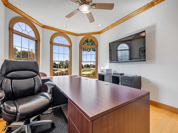 Exquisite home w/impeccable craftsmanship, top-notch finishes, & landscaped to perfection! From the stunning grounds, & 9-zone irrigation system to the 2-story entry porch, brick and stone exterior, 3-car side-entry garage the attention to detail is evident. Inside, discover natural wood flooring, crown molding, central vac, wood-cased windows, and 6-panel wood doors. Soaring ceilings grace the living room, open spindle stair, and hearth room with an 18-ft stone fireplace. The kitchen offers granite counters and 42" maple cabinets. The main level master suite has a trayed ceiling, luxury en suite w/ Jacuzzi tub, separate shower, & his & hers WIC's. The upper level features bedrooms 2-4 & 2 full baths. The finished lower level is versatile and spacious featuring a 1500 bottle wine room, library, rec room, exercise room, bathroom & sauna. Also noteworthy is the private backyard oasis with a beautifully stamped patio & soothing waterfall. All furniture stays with the home. Additional Rooms: Wine Cellar
