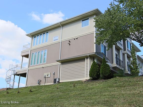 Introducing a one-of-a-kind end unit featuring the exclusive distinction of having 10 floor-to-ceiling windows spread across two levels, providing breathtaking, panoramic views of the Ohio River from both the 2nd and 3rd floors— a feature no other unit in the complex can claim. This open concept floor plan seamlessly integrates living spaces, making it ideal for entertaining against the stunning backdrop of the river views. Upon entry, a spacious ceramic tile foyer welcomes you into a dramatic Great Room adorned with recessed lighting, an elegant gas-log fireplace, and a ceiling fan, creating a harmonious ambiance. The five side windows, coupled with two large sliders, open up to a gigantic deck with retractable awning, further enhancing the panoramic viewing experience.