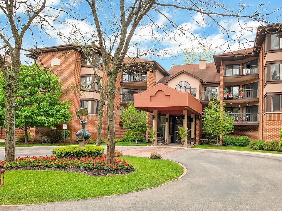 Rarely available corner unit with an easily accessible location. Refreshed white kitchen with large pass through to the DR & breakfast bar, it is further enhanced with an oversize slider and window. The spacious great room with wall of windows has a fabulous view of the pond with seasonal fountain. King size primary bedroom offers a private bath and WIC. Additional amenities are the in unit washer & dryer, 2 parking (tandem) spots in the garage & private storage locker. Pet friendly building - check rules / regs for specifics. This premier complex offers community rooms, fitness center and guest suite. Situated on 8 acres of mature trees and gardens, it is adjacent to Kletsch Park with its walking paths and water fall. Close to shopping and minutes to downtown. Professionally managed.
