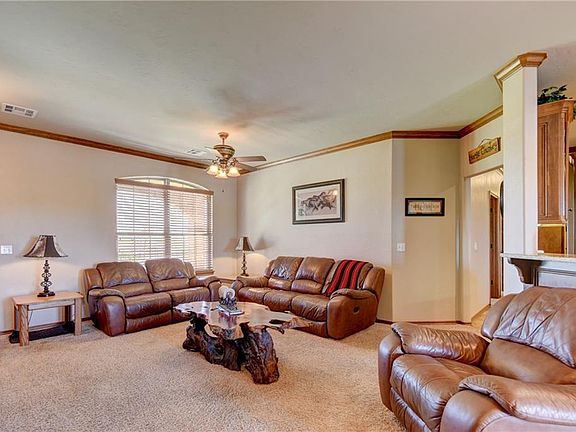 This stunning home sits on 5 glorious acres of land! Boasting a 30x50 garage and a separate 864 sq ft workshop with offices, this home also features crown molding throughout. The large living room is open to the chef's kitchen that includes a center island, granite counters, breakfast bar, travertine backsplash, stainless steel appliances, and under cabinet lighting. The private master oasis showcases double granite vanities, walk in tiled shower, whirlpool tub with tile surround, and a large walk in closet. This property also offers an oversized storm shelter, covered patio perfect for entertaining, and access to the highway and everything else you could want!
