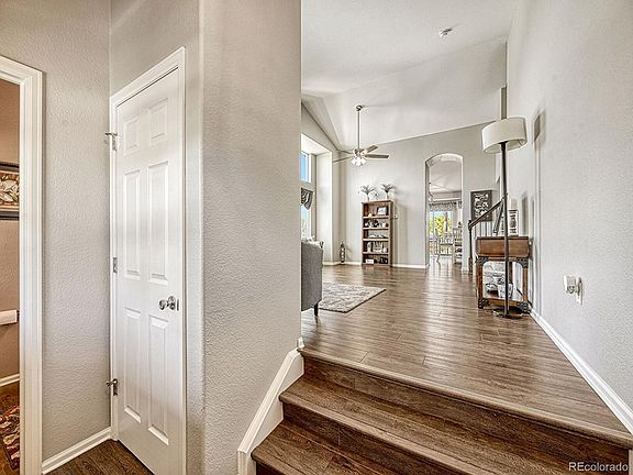The living room is a bright and vibrant space with high vaulted ceilings, scratch resistant wood like floors, and a ceiling fan that adds a touch of whimsy. The large great room has a gas fireplace perfect for those Colorado winters. The eat-in kitchen is a chef's delight, with stainless steel appliances, quartz countertops, and a vaulted ceiling that makes cooking a breeze.