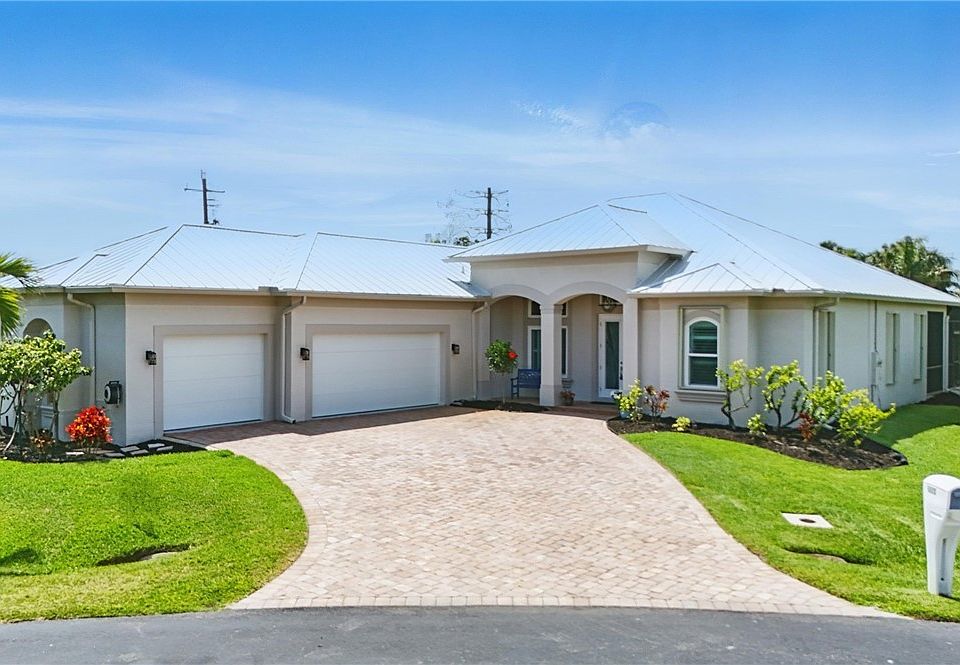 3BR + Den / 3BA Pool Home – 2,200 Sq. Ft. | Minutes from Sanibel Island, local beaches. Located within a quiet 21 home HOA across from the gated communities of Eagles Preserve and St. Charles Harbour, this beautifully updated home offers open-concept living featuring 10 ft. ceilings, elegant double door entry with artistic privacy glass, sliding glass doors opening to lanai & pool. Split-bedroom layout for privacy, primary suite cocooned behind 8 ft. frosted French glass doors opposite other bedrooms. Seamless vinyl plank flooring throughout. 8 ft. French glass doors to den/office. Remodeled kitchen w/ all new appliances, gas stove, cabinets, countertops & sparkling backsplash of sea blue hues. 3 updated bathrooms, all new white cabinetry. 8 ft solid core interior doors throughout. Standing-seam metal roof (post-Ian), Hurricane-rated garage doors, electric storm shutters front and back, Impact windows, & elevated whole-house generator. 3-car A/C garage, ceramic floor. Virtually untouched by hurricanes Milton & Helene. Located on a corner lot with sidewalks for walking and biking. Minutes to Publix, dining, and shopping. Perfect for year-round living or a seasonal escape. Enjoy Florida living at its finest—schedule your showing today.
