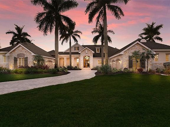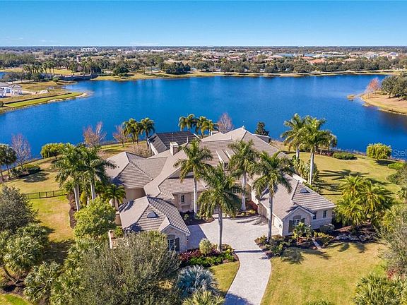 Absolutely breathtaking estate within the prestigious Lake Club positioned on 1.5 acres encompasses an impressive 600 feet of lakefront and features timeless appointments unique to this desirable community. The premier placement of the three-bedroom home affords outstanding 180-degree water views and abundant natural light from nearly every room. The 6,000 square feet is spread thoughtfully across one level with indoor and outdoor spaces that connect effortlessly by travertine, marble and wood flooring, custom wood-wrapped archways and French doors, and galleries that transition beautifully from room to room. The shared space of the great room and dining room is pure perfection for entertaining with a soaring coffered ceiling, stone fireplace surrounded by custom built-ins, discreet storage for fine dinnerware, and immediate access to the pool terrace. The elegance of this home has left nothing unaddressed. A wine room, spacious family room with octagonal wood-clad ceiling, and café nook is adjacent to a Gourmet kitchen. Kitchen accoutrements include Wolf and Sub-Zero appliances, five-burner gas stove with built-in steamer, wood cabinets and oversized island and stone surfaces. Family movie night is elevated with one of the finest in-home theaters with stadium seating, 120" CineCurve screen and acoustic paneling. The outdoor living area occupies a fully enclosed paver lanai and is practically a home all by itself, boasting a living area with fireplace, sunlit seating areas, full summer kitchen with Alfresco gas grill and bar, and a heated pool and spa overlooking, the Grande Clubhouse, stone bridge and picturesque lake. A sprawling and fenced green space are perfect for pets and enjoying outdoor sports. The master wing is unparalleled with premium lake views, coffered ceilings, dual offices, morning bar, 2 spacious walk-in closets and an en-suite spa bath with Roman shower and adjacent fitness room. The guest wing offers a morning bar and two-bedroom en-suites generous in size. Each wing features a private two-car garage. Additional notable features are whole house Crestron home automation with auto lighting, an oversized laundry room, icynene insulation, full house generator and new HVAC system. The Lake Club is the pinnacle of the Lakewood Ranch community and offering a private lifestyle and featuring walking trails, tennis courts, resort pools, dining and fitness center. All this near renowned golf courses, beaches, restaurants, shops, schools, medical amenities, sports facilities and more.
