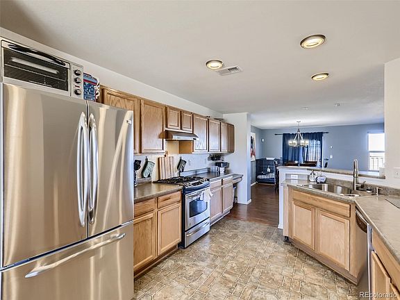 Buyer's Loan Fell! Their Loss, Your Gain! You are going to love this South facing Sundrenched home in move-in condition. As you drive-up you'll notice the yard has been meticulously cared for with a great front porch. Upon entering you will be greeted by large open kitchen with stainless steel appliances that flows into open dining and living rooms. The large family room is great for gatherings or just lounging on the couch. Extra entertaining room is easy through the sliding doors. Spacious yard is perfect for relaxing and entertaining with large trex deck. The main floor bath in tucked away for extra privacy. This gem features 4 bedrooms all on the same level. The 5-piece ensuite bath accompanied by large owner suite will be your sanctuary. Three additional bright spacious bedrooms and full bath give space for everyone. You'll enjoy fresh new carpet that has been purchased and will be installed before possession. All appliances stay. Close to DIA, Gaylord Event Center, CU-Medical Campus, with easy access to E-470, I-70, and I-225. Don't delay set a showing today!