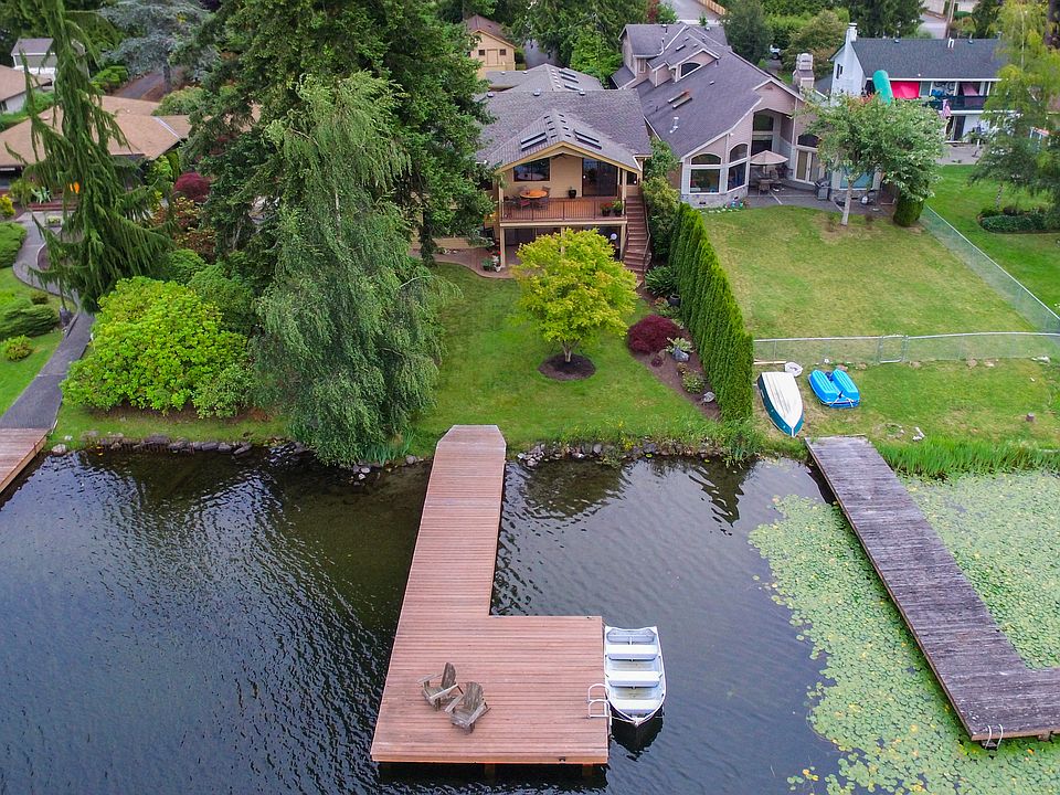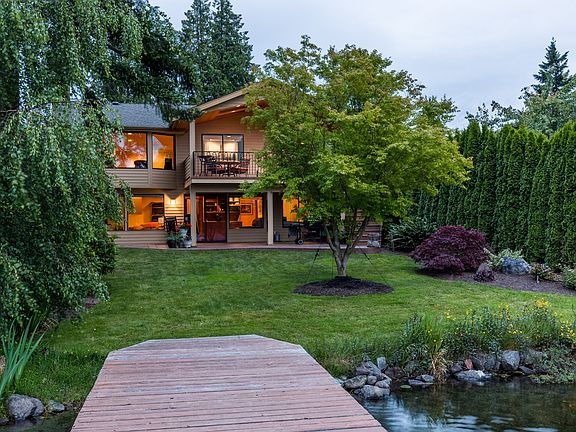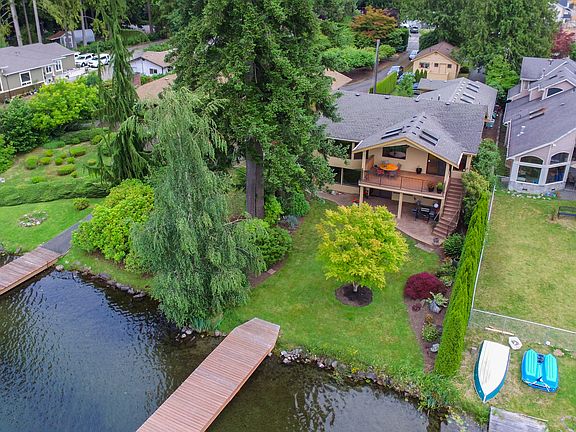 Stunning lakefront home with panoramic water views from all levels. Super private, 14,000+sf, westerly facing lot gets all the afternoon sun! Level, no bank beach area with tons of room to enjoy the yard & lake! Swim, fish & boat from dock. Gorgeous, remodeled granite kitchen & tile master bath. Spacious covered deck. Guest cottage currently rented @ $1,250/mo. Zestimate for the house is $903,000 and $292,000 for the cottage totaling $1,195,000. The $1,050,000 price includes both properties.