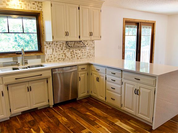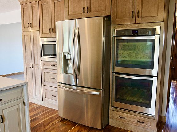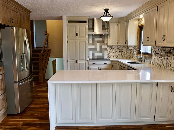 Located in northwest Mandan, this custom built 4 bedroom, 3 bathroom home has been updated both inside and out. The new triple lock Pella front door compliments the Pella architect series windows throughout the home with built-in roll screens and blinds. Enter the kitchen to see the two toned cabinets with waterfall quartz countertop, stainless steel appliances including the double oven, and custom tile backsplash. The kitchen hardwood flooring continues into the dining area that overlooks 1 of 2 backyard decks. The front living room has a large bay window with newer carpet. The upper level consists of 3 bedrooms including the master bedroom with updated bathroom and walk-in closet. The full guest bathroom with custom tile and laundry room with barn doors finish the upper level. Follow the custom hand railing and travertine stone stairs to the lower level family room with gas fireplace and half bathroom with walk-out access to the lower deck. The basement includes another family room with daylight windows and the fourth bedroom. The attached 2 stall garage is insulated and heated with a floor drain. Additional storage is available in the shed or storage area under the deck. The exterior also includes newer stone coated steel roofing, gutters, fascia and updated landscaping. gfLocated close to HA Kautzman Park and Roosevelt Elementary School.