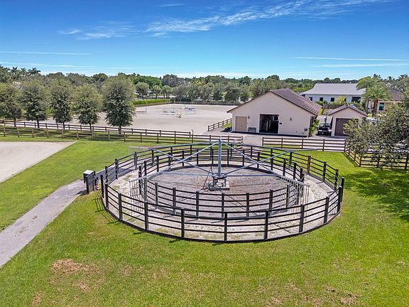 An equestrian dream opportunity: two adjoining properties totaling 3.75 acres with world-class equestrian facilities, including a fully equipped 7-stall barn with tack, feed, laundry, and full bath; a 5-stall barn with tack and feed rooms; multiple wash stalls; two sand arenas; a hot walker; and five paddocks. Three gated driveways and mature landscaping provide privacy and ease of access, just minutes from the Wellington International, Global Dressage venues, and Wellington's dining and shopping--perfectly timed for show season.The main residence is a modern entertainer's dream with bright, wide-open spaces, soaring ceilings, and nearly floor-to-ceiling windows. The entry leads into a striking, one-of-a-kind wine room. Italian marble and wood flooring flow throughout, complemented by a custom office, formal dining, a gorgeous loft, and a spectacular kitchen with a huge center island, custom cabinetry, and a double pantry. An elegant indoor bar provides a separate space for entertaining.
