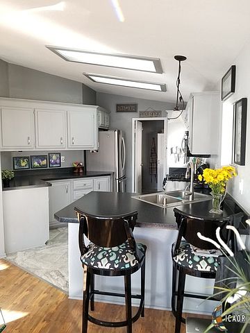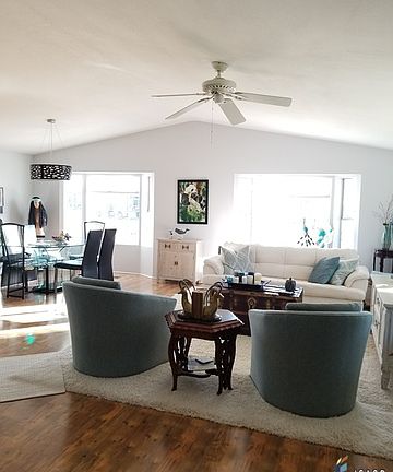 Lovely open floor plan full of light with a beautiful view of the lake from the wrap around deck. Welcome to Storms Crossing where the community is laid back and friendly. Adjacent to the lovely lake and just a quick golf cart ride to the 9 hole golf course. Golf for 2 is included with the space rent. This lovely home was recently been freshened up with new paint and flooring. It is move in ready! Perfect for year round living or for winter visitors. You must see this immaculate home!