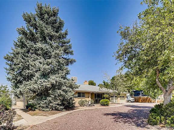 You will find this property to be a rare opportunity to have a slice of country living within the city. This well built brick ranch sits on a corner lot with a full 1/2 acre of land! There is adjoining open space that affords beautiful views of Mt Evans and wonderful sunsets from the shady and spacious patio. The extensive park-like yard is fenced with a dig-proof, 6 foot chain link fence that will keep even the most rambunctious pets both safe and secure. There is an oversized, naturally enriched garden area for growing bountiful vegetables and flowers. The yard and garden will remain plush with water from your very own private well. No water bills! A city water tap is also available if desired. The property includes numerous shade trees as well as fruit trees, which include apple, plum and mulberry. There is an 8x10 wood storage shed and 2 large dog runs. The expansive circle drive provides substantial off street parking for multiple vehicles. In addition, there is RV parking on one side that will accommodate larger RVs, boats, etc. No HOA. The charming country home is one level with 4 bedrooms (one non-conforming), 2 bath, and an open floor plan. There are ample cabinets and counter tops in the spacious kitchen. Other amenities include an (almost new) water softener and a R.O drinking water system. The hot water heat and evap cooler are both efficient and economical! Easy access to I70, I225 and E470 and without their traffic noise. Schedule your private showing soon to see this truly unique property.