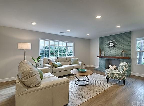 You will love this beautifully updated, single story home, in the North Tustin School District! It features 3 bedrooms plus a large addition which could be used as a 4th bedroom, game room, ADU, etc. (currently set up as a family room). The charm and designer touches start at the curb, with a park like front yard, fresh paint and upgraded windows and doors. Step inside to an open concept layout with big spaces. The living room, with gas fireplace is large enough for a piano, the dining area is ready for a big table, and the kitchen will surprise you with a large eat-at island and lots of cabinets including 2 pantries. The vaulted ceiling and skylights contribute to the bright open feeling. The finishes are fantastic...designer flooring, counters and tile throughout. The kitchen is a chefs dream with a 36" pro convection range and hood, microwave drawer and a Bosch dishwasher. Off the dining area is a former sunroom updated and water proofed with a new heating/AC unit. Down the hall find 2 nicely sized bedrooms, updated bath and laundry closet. The master is big with a desk area and walk in closet. Slide open the barn door to a spa like master bath. The walk-in shower is huge and beautifully finished with Carrera marble accents. Or, relax in the freestanding soakers tub surrounded by wainscoting. Dual vanity sinks and marble counters complete this pretty space. Outside, the backyard is big enough for a pool and comes with avocado and lemon trees. Behind the walls, the furnace/AC and hot water heater are newer and recently serviced. Much of the ducting has been replaced. The home has been re-piped and has a new electrical panel. Schools, parks, shopping, and highways are close. Don't miss this fantastic home!