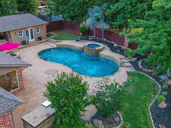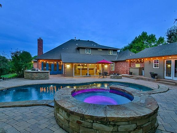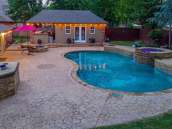 This grand home has everything you need to entertain. Upon entering, you are welcomed by a beautiful large formal dining room and an office space with its own fireplace. Both rooms are abundant in natural light, with detailed molding and plantation shutters for character. The spacious family living area is an open concept with magnificent built-ins from floor to ceiling surrounding the second fireplace. Beautiful custom french doors allow natural light to flood the room. The large kitchen features granite counter tops, stainless steel appliances, ample storage and an enclosed coffee bar. Just beyond the kitchen, you'll find a 16x24 multipurpose sunroom with its own bar with picture windows and a sliding doors leading out to a gorgeous hot tub and pool combo wrapped in flagstone and mature landscaping. No need to worry about wet floors- the private pool house has two changing rooms and a full bathroom for easy cleaning and changing for all your guests. Enjoy your outdoor cooking space while spending time with friends and family by the pool.