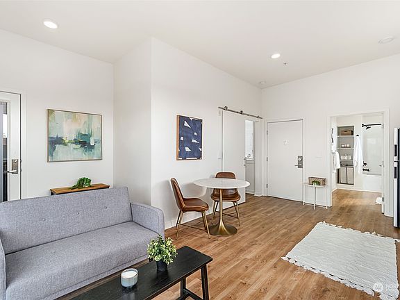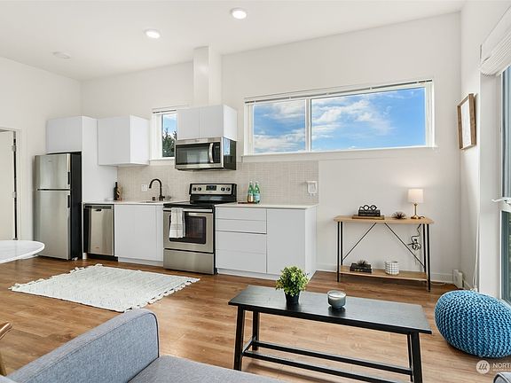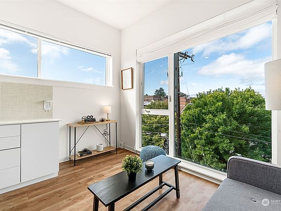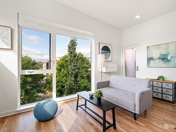 Welcome to your sunlit sanctuary! This top-floor unit offers tons of natural light through the expansive floor-to-ceiling windows & the custom top-down-bottom-up shades provide flexible control over light & privacy. Living room features a cozy nook, perfect for work from home w/ a distinct separation from the rest of the living space. Spa-like bathroom w/ an extra deep tub surrounded by solid marble. Equipped w/ Smart Wi-Fi & voice assistant-compatible light switches, door lock, & thermostat, ensuring convenience & control at your fingertips. Secure parking spot & storage space.  Fabulous rooftop deck w/ BBQs & views of the Seattle skyline. Close to restaurants, grocery stores, parks & more. No rental cap & short term rentals permitted!