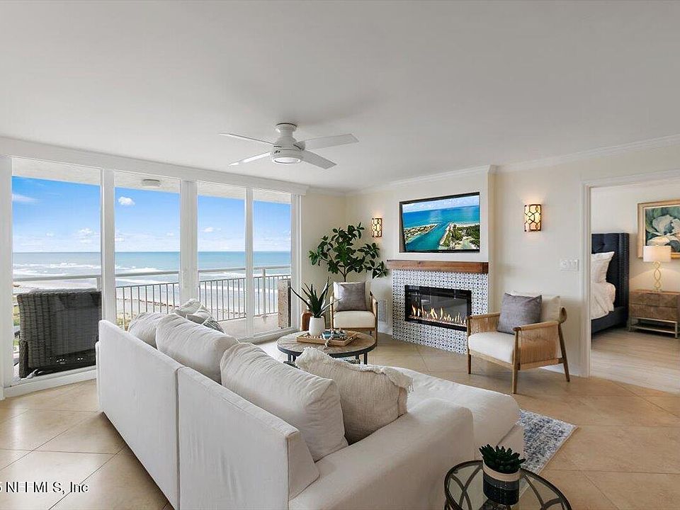 Beautifully appointed 2BR/2BA condo w/40' balcony with sunrise & sunset views. Enjoy beach & downtown Jax fireworks & the Blue Angels without leaving your balcony! Floor to ceiling glass doors w/automated shades. Living rm w/custom FP. Kitchen w/GE Profile SS appl, glass back splash & quartz. Dining w/glass front buffet & b'fast bar. Outdoor dining & sitting area to take in ocean breezes. King primary suite w/large walk-in custom closet, additional closet, bath w/walk-in shower, custom niches, & double vanity w/quartz. Hall closet for storage. Queen BR w/closet. Stacked W/D in unit. Guest bath w/large soaking tub & rain head shower. Designer touches throughout. HOA dues include fitness cntr, (2) pools, grill area, bike storage, building ins, water & sewer, trash, grounds maintenance & on-site property mgmt. $7 million restoration completed May 2025 & assessment PIF. SELLER REQUIRES pre-approval or POF letter to tour this home.