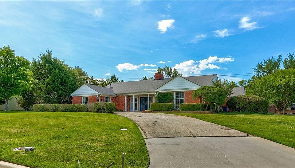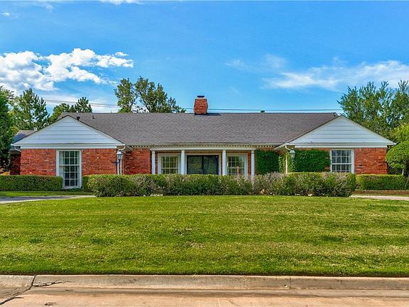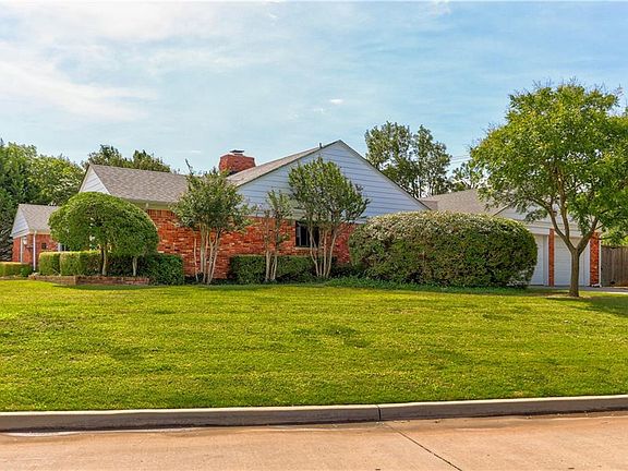 Open floor plan with big rooms and vaulted ceilings makes the home seem bigger than the reported Oklahoma County Assessor square footage. Great flow. Wall of windows looking out to backyard. Light and cheerful interior. Oak floors in living and dining areas. Brick floors in kitchen. Two large beds each with their own bath and walk-in closets. On 1 level. Located at the corner of Randel Road and Glenbrook Terrace. Cirlce drive for front door entrance and separate side driveway for garage entrance. Big back yard. Needs some updating but excellent location and great charm make it a very appealing home. Buyer to verify taxes and schools.