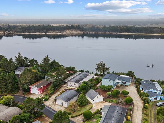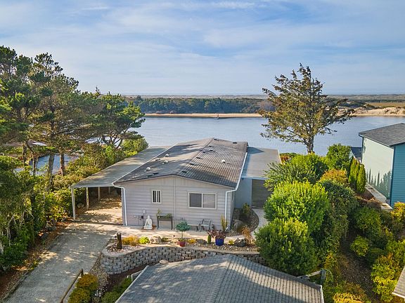 Waterfront beach house in Florence, Oregon! Sunset, river and dunes views from this immaculate single-level home. Walk into bright floor plan with wall of windows facing the water, stunning custom kitchen with Corian counters, eat bar/island, tons of counter space and cabinets, and large primary suite with attached bath. Dining area has slider to covered concrete patio with all new landscaping, sprinklers and drainage for a perfect greenscape that creates privacy and accentuates the views! RV garage is 24 x 36 with 1/4 bath, water, RV dump and extra deep workshop.  Property is perched on a large landscaped lot with switchback trail down to the water with sitting area and bench to enjoy the sunsets! HOA fee includes cable/internet, water/sewer, garbage/recycling and use of common areas pool, sauna, hot tub, etc. Unit #557 - Must see!