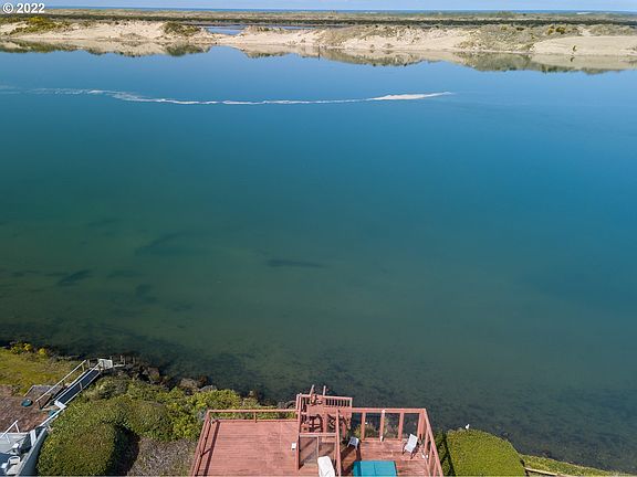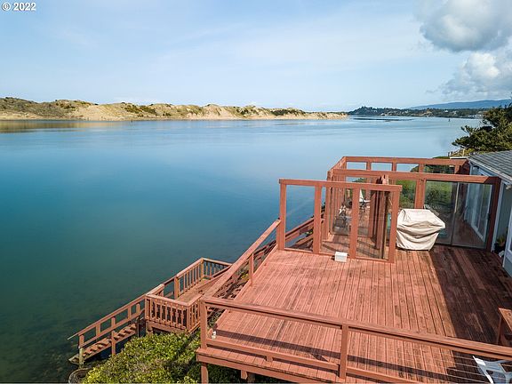 Panoramic River and Dune views from every room. Steps down to the river's edge; large entertaining deck & glassed in area for wind protected hot tub. Open floor plan w/primary bdrm on opposite end. Two bedrooms were combined when home was placed to make one lg 2nd bdrm. Primary bdrm has 10 x 14' walk-in closet permitted addition, slider to  hot tub. Dbl 22x24' garage plus RV pad & dumpsite. Roof on home & garage 2019. Seller to include new SS refrigrator, dishwasher & stove($2000 value).