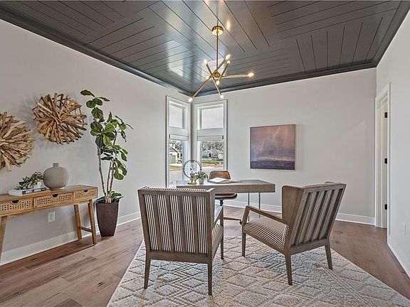 READY NOW! The stunning Sydney - a 1.5 story packed with both function and aesthetics on a treed site that provides both privacy and a serene setting. Entering the foyer you are met by a handsome home office with elegant ceiling details, French doors, and modern lighting, as well as the first of 5 gorgeous full baths. The main living space of the home is breathtaking, with a showplace kitchen that boasts loads of storage, under-cabinet lighting, a custom range hood, an enormous waterfall quartz island with pull-out utensil and waste drawers, and an exceptionally large walk-in pantry. The kitchen is equipped with built-in stainless steel appliances and is well-lit by the many windows in the adjacent dining room. The great room features a soaring ceiling with a modern chandelier and built-ins with under-cabinet lighting flanking the fireplace. Large picture windows bring the outdoors inside and provide excellent view to an oversized patio that provides so much sheltered leisure space. The primary suite has beamed ceiling detail with transom windows for extra light, while the amazing bath is both elegant and functional, featuring a freestanding soaker tub with walkaround shower and dual vessel vanity. The expansive closet conveniently connects to laundry and a storage-heavy drop zone/mudroom. Upstairs the large loft with built-ins overlooks the great room and leads to three generous bedrooms. Rooms 2 and 3 share a shower/bath over designer tile, but with private vanities. Room 2 enjoys a well-appointed private bath. The finished lower level is just as functional with a 6th bed and 5th full bath and room to add a 7th bedroom! The rec room has the added bonus of a wet bar with beverage cooler, custom built-ins for home study or game day/movie night dining. The adjoining multi-function room is perfect for games, billiards, crafts, or even a wine cellar. This home is a show stopper with convenient city access, excellent amenities, in a socially active community.