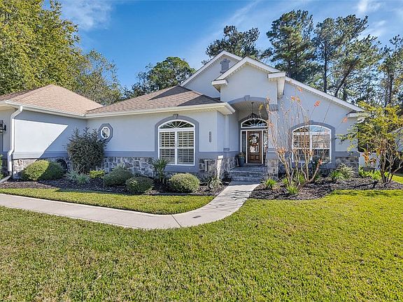 Kitchen with granite counters, tiled back splash and stainless steel appliances. Spacious primary suite with access to lanai, primary bathroom with separate shower, soaking tub and double vanities. Living Room opens to a large screened lanai over looking a private wooded preserve and beautifully landscaped, fenced in yard.