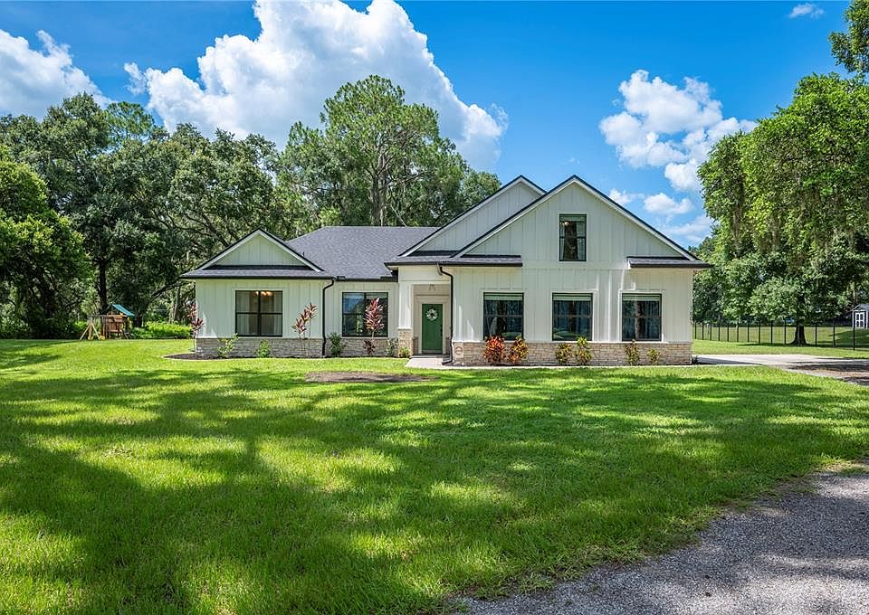 Welcome to 1601 W Oak Dr. A stunning 2020-built modern farmhouse, and a perfect blend of contemporary elegance and rustic charm. This spacious home features 5 bedrooms and 2.5 bathrooms, offering ample space for family and guests. As you approach, you'll be greeted by a beautiful driveway lined with mature oak trees, leading up to the home and providing a picturesque and serene entrance. Step outside to a beautifully landscaped yard, ideal for outdoor gatherings and relaxation. As you enter you will fall in love with the gourmet kitchen, equipped with top-of-the-line appliances, custom cabinetry, and a large island adorned with beautiful quartz countertops, cooktop & pot filler perfect for culinary enthusiasts and when hosting for the holidays! Enjoy movie nights in the luxurious theatre room, equipped with a 120 inch projector screen, surround sound system, and wet bar, or make use of the versatile bonus room that can serve as a home office, gym, or playroom. The open floor plan seamlessly connects the living spaces, creating a warm and inviting atmosphere. Double tray ceilings, crown moulding, and large windows flood the home with natural light, highlighting the exquisite finishes and thoughtful design throughout. The primary bedroom is exquisite & a true retreat from the stress of a long day with the en suite bathroom that includes a gorgeous soaking tub, tile shower, & double vanity. The location is serene at the end of a dead-end street with minimal traffic you will feel like your truly out in the country while only being a short distance from shopping centers, grocery stores, and medical facilities along with being only a few miles from i4 for easy commuting to Tampa and Orlando. This modern farmhouse is not just a home; it's a lifestyle. Don't miss the opportunity to make it yours!