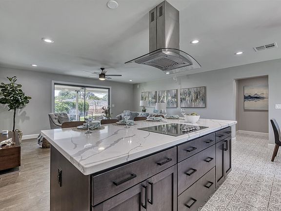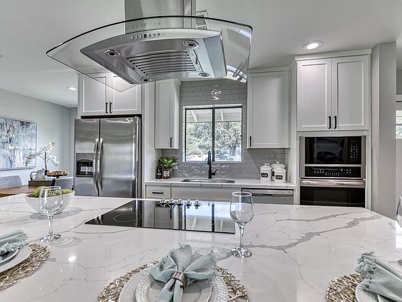 Stunning remodel w/4 beds, 3 baths & 1870 SF of open living space! Enter thru new front door into an open great room & all new kitchen w/views thru the large slider to the spacious covered back patio w/gas firepit & gas stub for BBQ. Large kitchen island w/plenty of seating, Calcutta Quartz counters, stainless appliances, floating range hood, new Shaker cabinets w/tons of storage space, large farmhouse sink, touch sense faucet & in-kitchen dining area. New baths w/Calcutta Quartz & Shaker cabs, new fixtures & polished subway tile w/stylish accents & master bath w/barn door. New Trane 5-ton AC, new low-E dual pane windows, upgraded electric pre-wired for surround sound, recessed LED lights, contemporary ceiling fans & new paint inside & out. Brick construction w/new sand stucco finish.