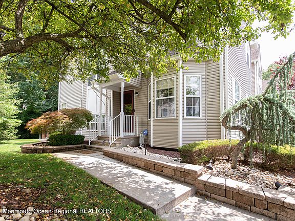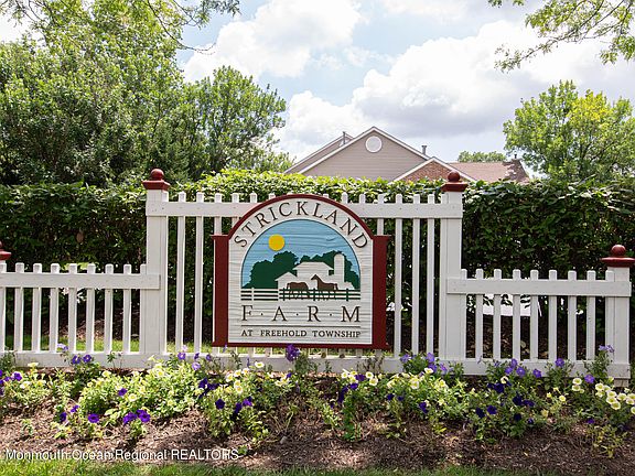 Strickland Farm in desirable Freehold Twp. presents this end unit townhome. Over 1700 sq ft .. 3 beds 2.5 baths & basement Enter into the foyer with newer vinyl laminate floors and beautiful iron staircase. Floor plan is open and spacious. EIK features sliders to outdoor private patio backing to woods.