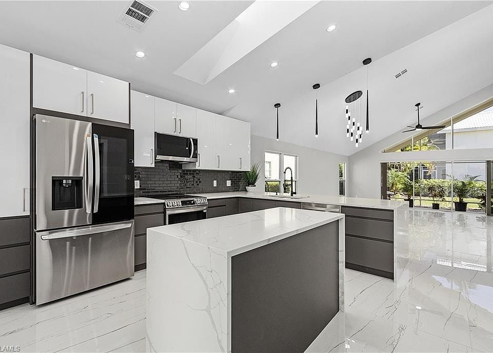 Enjoy morning coffee and fresh air on the private screened lanai surrounded by palm trees and grill your favorite meals with spectacular sunsets. Completely renovated bright home feels like new construction. It is the most desirable 2 story floor plan with oversized master suite DOWNSTAIRS, 2 guest bedrooms and bath upstairs. The home has tons of upgrades including: brand NEW IMPACT RESISTANT WINDOWS, New Kitchen, all New Bathrooms, new Appliances, Porcelain Tiles, New Oak Stairs, modern LED Light Fixtures, 2 closets in master bathroom and Waterfall Island in the kitchen. Golf/social memberships are offered at Imperial Golf Club but not required. Low HOA includes insurance (covers ROOF), exterior of your home, cable, 24h guard at the gate, community large heated swimming pool, clubhouse with small kitchenette, two regulation tennis courts, miles of sidewalks for biking/walking and is pet friendly. This home is perfect for full time or seasonal stays with the family as well as investors (liberal rental policy). North Naples fantastic location is close to restaurants, 10 min to sandy beaches, shopping,International Airport and is in one of the top Naples school districts.