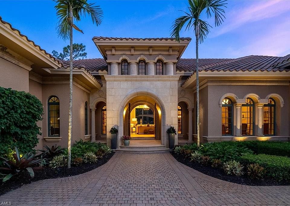 H10480 -Magnificent sprawling ranch estate home that will take your breath away. This custom-built BCB HOME boasts marble flooring on a diagonal, neutral painted walls, coffered ceilings, decorative chandeliers, and a gas fireplace with decor niches that flank the space. The family room overlooks the covered lanai, pool, and has two sets of corner fully pocketing sliders, allowing for plenty of natural light to flood the space. The owner's vestibule features double doors, a large bedroom w/a sitting room & access to the rear pool area, two closets, and an extra laundry room. The spa-sized owner's bath boasts large vanities, two water closets, a walk-through shower, and a separate tub. Each guest suite is spacious, with large walk-ins featuring built-in shelving & en-suite baths. There's even a drop zone at the garage entrance and a large first-floor laundry room. Outside, you'll find a large pool with a 25' lap area and cascading spa, perfect for relaxing after a long day. There's also an outdoor fireplace, summer kitchen, bar area, and a separate pool bath. The home overlooks the golf course with southern exposure, providing stunning views year-round.