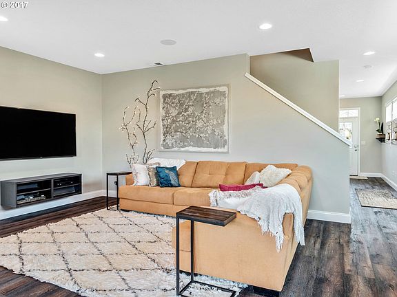 One of a kind end unit townhome next to community space. Upgrades include: Samsung black stainless appls w/family hub fridge. LVP thru main~lifetime warranty. Portland Closet Co in master, built-in office nook, custom built-in bed w/entertainment center, murphy bed, custom paint. Outside boasts over 500 sqft of concrete patio w/hot tub. Amazing home for entertainment & perfectly designed living. Clubhouse, bball, walking trails & pool.