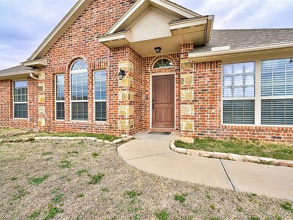 Step inside this fantastic 4-bedroom, 3-bathroom, 2-living room residence, nestled in a serene cul-de-sac on a vast acre of picturesque land - truly a must-see! This delightful home is meticulously crafted with a split layout, offering a secluded haven in the owner’s suite which features a large bedroom, a bathroom with double vanities, soaker tub, separate shower and large walk-in closet. All additional bedrooms are very spacious and offer ample closet space. Two of the bedrooms are connected by a Jack & Jill bathroom in the opposite wing. The open living room and kitchen combination provide ample storage, tons of counter space and a practical island plus a great entertaining space nestled around the beautiful fireplace. You will also love the flexible space this home offers with a huge bonus room and a formal dining which could also opt as an additional sitting room. Step outside to the extended rear patio for fresh air and a view of the expansive backyard. With updated lighting fixtures throughout and a storms shelter, this home exudes a welcoming and cozy atmosphere. Don't miss out on the opportunity to schedule a tour and discover this extraordinary property today!