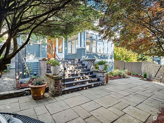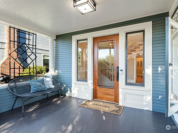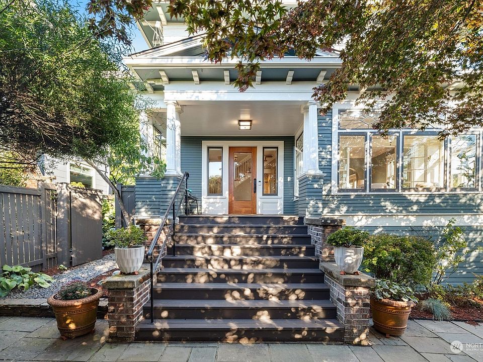 Situated high above the street on a corner lot with lovely views of Puget Sound and the Olympics from the upper floor, this beautiful 1907 Craftsman home effortlessly blends historic charm with modern amenities. The main level features a beautifully remodeled kitchen, equipped w/contemporary appliances, slab stone countertops, and ample storage—perfect for culinary enthusiasts. Adjacent to the kitchen, you'll find a bright dining area with access to a large deck, ideal for gatherings and entertaining. Upstairs, discover three generously sized bedrooms, including a serene primary suite, and two remodeled bathrooms. The fully finished basement provides additional living space, whether for a home office, recreational room, or guest suite.
