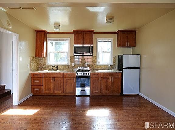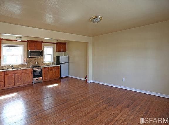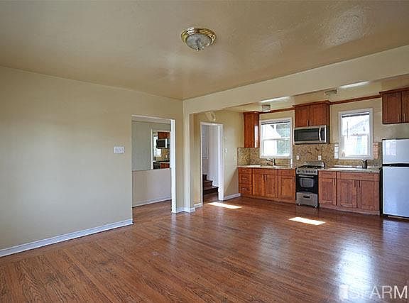 First floor 1BR/1BA near Ashby at California. Apartment is in a mostly stand-alone home which is part of a complex of similar units enclosing a yard. Floors are hardwood except in tiled bath. Large open living/dining room/kitchen has kitchen across the back wall overlooking the yard. It includes gas stove and microwave.