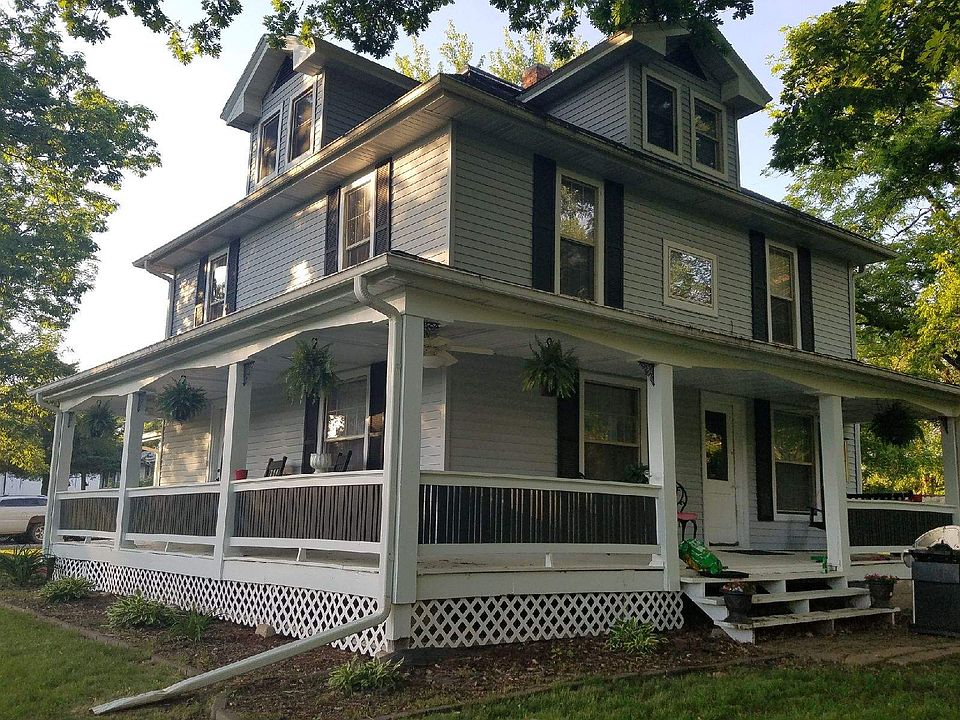 Beautiful updated four square farmhouse on almost 2 acres. 3 bdrm 2 bath, 2 car attached garage and garden shed. Beautiful butcher block counters and breakfast bar. Antiqued light fixtures. Antique wood burner. Gorgeous walnut staircase, oak floors and woodwork throughout home with pocket doors. Park like yard with garden and creek. 6000+ acres of Hawkeye Wildlife conservation ground across road so lots of birds and deer etc. Very peaceful to sit in the rocker on the porch and watch the sunset.