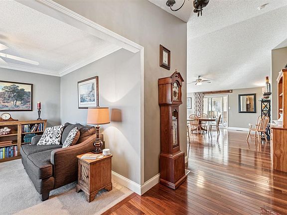 Well-kept generously sized 3-bedroom ranch in Wentzville golf course community. Main areas have real Teak wood floors, a large bay window in the dining area, a beautiful Sunroom with a scenic view of woods, and lots of sunshine throughout. Main Floor laundry is conveniently located near bedrooms. Downstairs is finished with a large den and ventless gas fireplace, recreation room with walk-in closet, large storage area and a full bathroom. Dry basement. HVAC just replaced in 2022 and roof replaced in 2016. Outside, there's a large concrete patio and garden shed. Additional Rooms: Sun Room