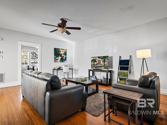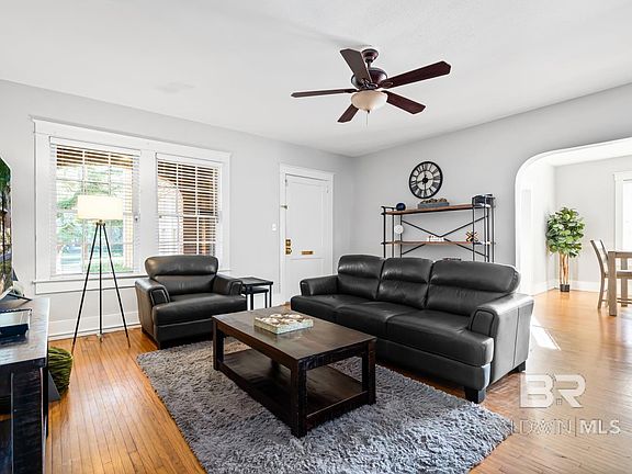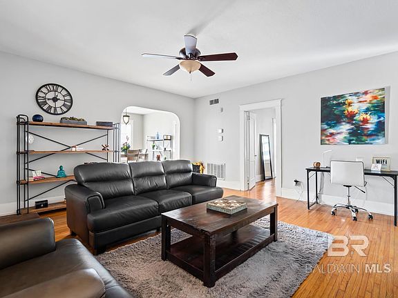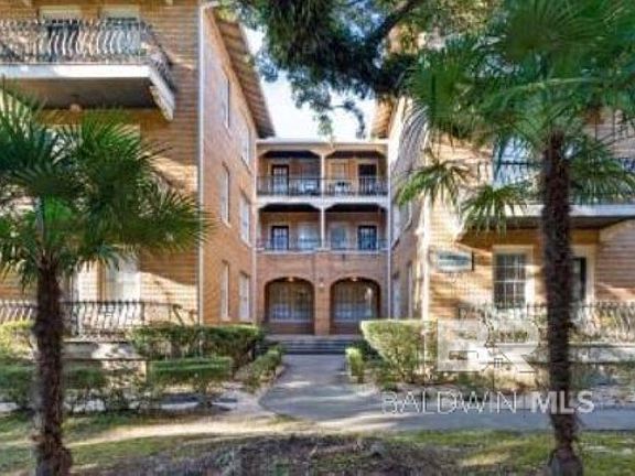 The best of Midtown Living! Move in ready and elegant first floor 2 bedroom/ 1 bath condo in historic circa 1930's Windsor Warwick Condominiums in the Old Dauphin Way Historic District. Little more than a city block walk to 2 coffee shops, the Winn-Dixie and more! Furniture is negotiable and not included in sale of the condo. Another area of shopping is just 1 mile away includes Nixon's bar, Dew Drop Inn, and Big Bad Breakfast for brunching. 1.6 miles to downtown Mobile and Mardi Gras parade routes. Floor plan overlooks a front porch area (with about 8 x 6 of space for the condo owner) with 17.6 x 16.8 living room, a large separate 12.10 x 12 dining room with attached kitchen, with two large bedrooms sharing a bathroom. One bedroom is 13.4 x 12.4 and the 2nd bedroom is 11.10 x 11.5. It features beautiful original hardwood floors, renovated white cabinets with black granite countertops and brushed silver accents in the kitchen, with large black floor tiles. There is room for a little breakfast table for two if one wanted to utilize the large dining room for another use like an office. The bathroom has a classic look with white tile with black accents and black tiled floor for an updated look. 2" faux wood blinds, plus appliances such as refrigerator with ice maker, stove, and dishwasher will remain. Combo washer/dryer can remain as well. The condo association is short term rental-friendly and has $245 per month dues that cover water, sewer, garbage, exterior insurance, roof (new 2021), termite bond, and updated laundry facilities, although this property has a concealed combo washer/dryer in the kitchen. Close to Leinkauf Elementary and Murphy High School. Plenty of parking in the condo back lot for you and your guests. All measurements are approximate and not guaranteed, buyer to verify.