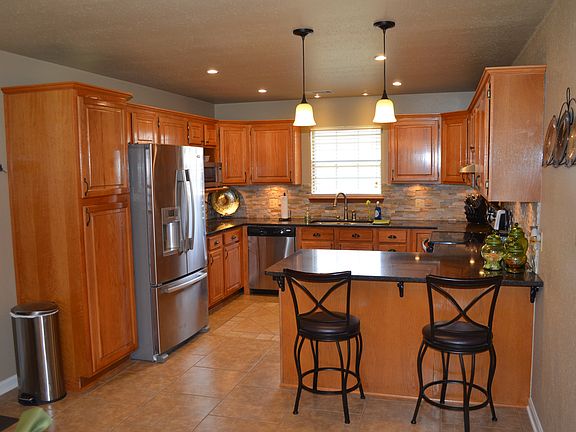 GREAT NEIGHBORHOOD! 1602 Oak Hill. Sitting at the end of a quiet and spacious neighborhood, this recently-renovated home sits on approximately one-acre with a large fenced backyard, nice 24x30 shop with electricity, and a large two-car garage that contains an additional storage room. The property includes a 12x40 RV shed wired for 30 and 50-amp services. 4 bedrooms (One is currently being used as a home office.), 2 ½ baths, and a large laundry room make up the 1,952 square-foot house. All renovations include customized details: quartz and granite countertops, fresh paint in every room, crown molding in the main living areas, LED lighting throughout the home for energy efficiency, kitchen cabinet accent lighting, tile floors, and customized master bedroom closet systems for ample amounts of storage. The exterior boasts LED landscape lighting and a security camera system that can be viewed on your phone. Smart Home technology allows for the garage, interior lights, and thermostats to be controlled on timers or from your phone when away from home. The garage door, house and shop roofs, and gutters were replaced in 2018. Other features include a wood-pellet stove in the living room for a secondary source of heating, gas furnace, and a gas 50-gallon water heater. Stainless steel Whirlpool Gold kitchen appliances, Whirlpool washer and dryer, and all wall-mounted televisions will convey. You must see to truly appreciate this home!