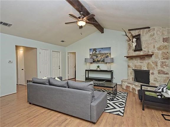 Charming one story stone home lined with mature trees. Home features an open floor plan, large stone fireplace, and vaulted ceilings in living. Ceiling beams in master and family living room. Laminate flooring throughout & double paned windows. Master bedroom has his-and-her closets & double vanity. Covered deck with fenced-in private yard space.