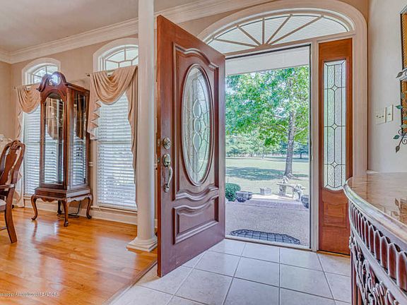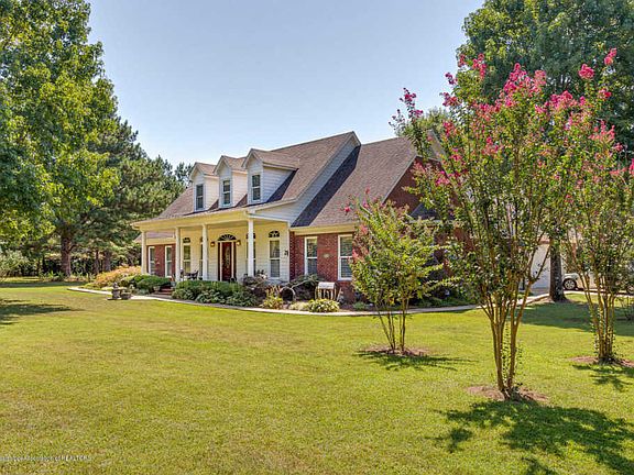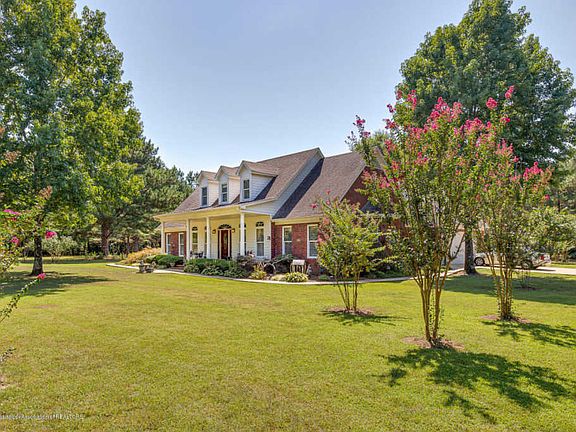 Come check out this lovely four bedroom, three and half bathroom home on nine and half tranquil acres of land in Byhalia. As you drive through the gated entrance, you'll notice the peaceful winding driveway, well maintained lawn, mature trees, inviting front porch, and lovely brick exterior. The foyer reveals an open floor plan with sight lines through to the dining room, great room, and kitchen. The large great room boasts beautiful hardwood floors, crown molding, a double sided fireplace and mantle, and double door access to the sun room. The open eat in kitchen features a wealth of cabinet and counter top space, a desk, a pantry, and a center cooking island perfect for your next great meal.