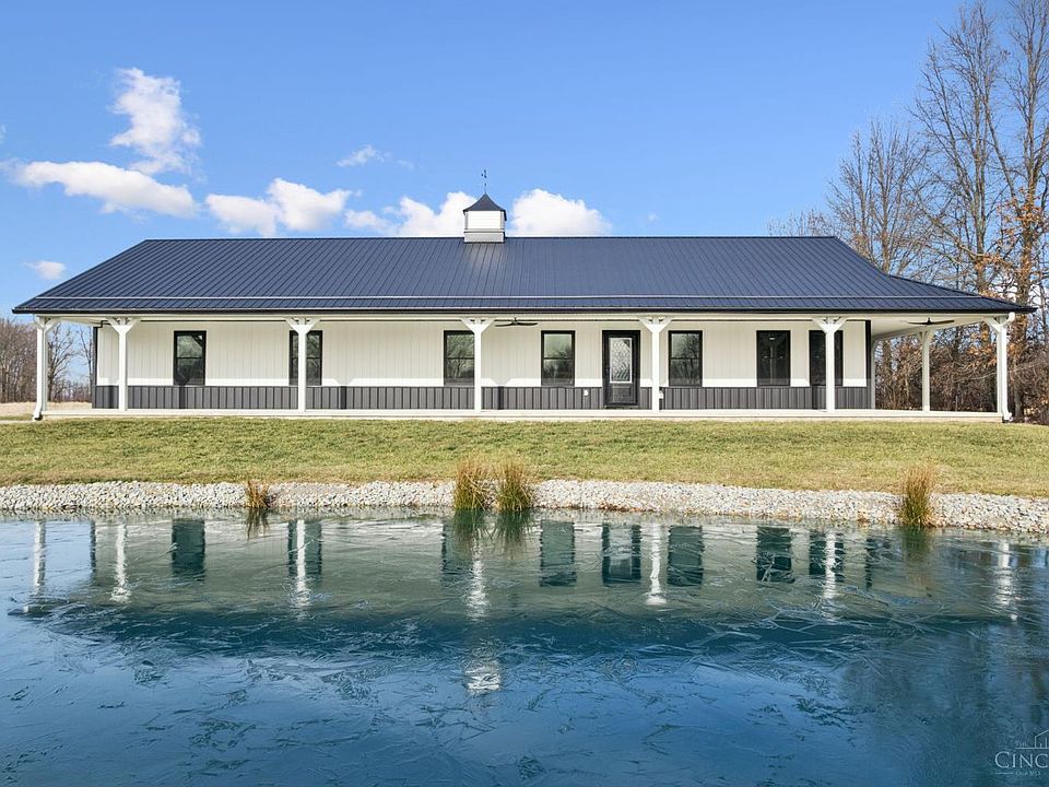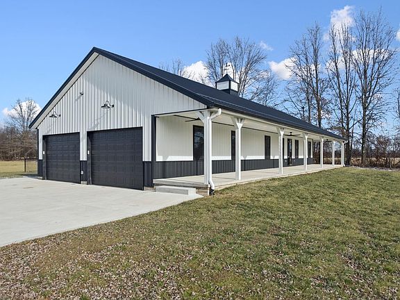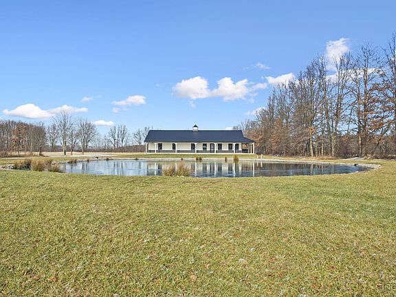 Situated on 6 private, usable acres in Blanchester, this newly built barndominium style ranch offers exceptional craftsmanship with no expense spare. The open concept design features beautiful wood flooring throughout, soft close kitchen cabinetry, stainless appliances, and stunning quartz counter tops. The spacious primary suite includes a luxurious marble walk in shower, double vanity, private water closet, his and her closets, and walk-out access to a wrap around porch and private hot tub. Enjoy breathtaking views from the unmatched front porch overlooking a fully stocked and aerated pond. Relax on the covered back porch with views of the 2nd pond, surrounded by peaceful nature. The front barn is fully heated and cooled and offers the potential for a complete second living quarters (ADU) with full kitchen, laundry room, and full bath. Also ideal space for home business,any hobby, or entertaining. This one of kind property delivers luxury, versatility, and serene country living.