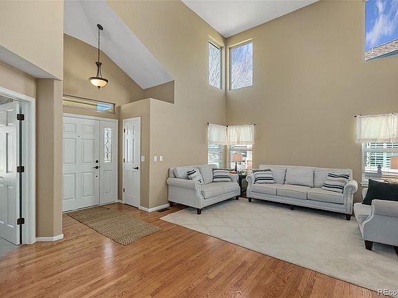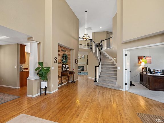 Welcome home to this stunning and spacious Stonegate gem! Beautiful hardwood floors gleam throughout the main floor and are accented by soaring ceilings, fresh paint, and brilliant natural light. Designed with entertaining in mind, the flexible floorplan offers an elegant formal dining and living room as well as an open concept family room and eat-in kitchen that are anchored by a sleek gas fireplace. The well-appointed kitchen delights with granite countertops, a large island with seating, handsome cabinetry, a tile backsplash, and stainless steel appliances including a gas range. The main floor is completed by a laundry room, a powder room, and a lovely office highlighted by double doors and built-ins. Ascend the striking curved staircase to the upper level primary suite that impresses with double door entry, a vaulted ceiling, and an exquisitely renovated 5-piece bathroom complete with a marble tile floor, beadboard wainscoting, a free-standing soaking tub, a luxurious tiled shower, and dual vanities atop granite countertops. 3 sunny secondary bedrooms and a full bathroom with double sinks round out the second floor. More living space awaits in the finished basement that hosts a sprawling rec room with built-ins, another bathroom, and a confirming bedroom. Enjoy grilling out, playing fetch with Fido, and outdoor parties from the sizable fenced backyard that features mature landscaping, an expansive stamped concrete patio, and a firepit. Amazing location on a low-traffic peaceful street that is blocks from Pine Grove Elementary, miles of trails, parks, the community pool, and restaurants. Relish quick access to King Soopers, shopping, Parker Rec Center, E470, and I25.