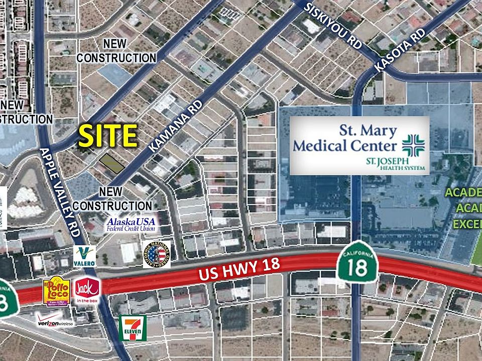 0.24 acre commercial lot located on Kamana Road in the heart of Apple Valley's medical community. Property is within walking distance from St. Mary's Medical Center and is ideal for a private medical office. The location benefits from the daily traffic of the established medical practitioners and the residents of the exclusive custom home community, Desert Knolls. Enjoy easy access to Highway 18 and the I-15 Freeway. Neighboring businesses include Loma Linda Foot and Ankle Clinic, Alaska USA Federal Credit Union, Apple Valley Radiology Center, Glenn Dental and more. A great opportunity to claim a part of limited properties remaining in this community. Many new developments are in progress nearby. Property is zoned C2 General Commercial allowing for a wide variety of uses. All utilities available at site. Must see!