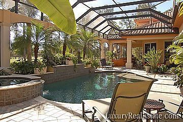 Two Story Single Family Home with Southern Exposure and Fairway Golf Course Views! This Lavish Estate home has 4 bedrooms plus den, 4 full baths, 1 half bath and an abundance of upgraded features throughout. Volume and coffered ceilings, crown moldings, extensive windows with gracious window treatments, custom faux finishes, detailed arched passageways, elaborate custom flooring and gorgeous furnishings. Enter through the ornate wood entry doors and step into the column lined foyer where you are greeted by the lavish living room featuring an elaborate gas fireplace and two sets of French doors leading to the outdoor living space. Kitchen features rich wood cabinetry, stainless steel appliances including Sub-Zero and Wolf, double wall ovens, custom tile backsplashes & granite counter tops on work surfaces, breakfast bar and center island. Relax in the professionally landscaped lanai with southern exposure, outdoor kitchen,gas heated in ground pool & spa overlooking the 4th Fairway.