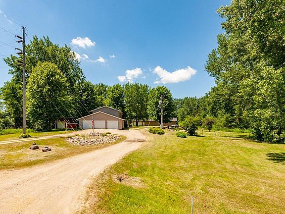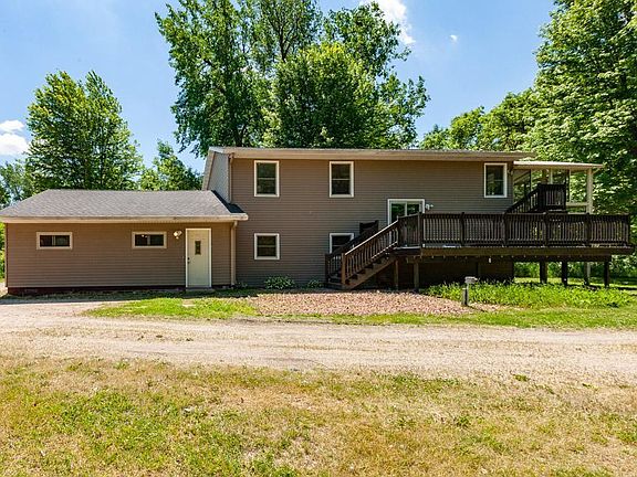 Looking for a place to store all of your toys? Set on nearly 3 tree lined acres, this lovely home has all the space you need and more. Featuring a 2400 square foot insulated shop with heat and air conditioning, and you can transform the inside to whatever suits you. The home itself boasts a 3 car attached garage, and is charming and clean. The kitchen has long countertops perfect for cooking, and space for a large dining table. There is an inviting living room just off the kitchen that flows nicely into a 3 season porch and enormous deck. The primary bedroom has a walk through bathroom and 2 additional bedrooms on this level. The generous walkout lower level features a bedroom, bathroom, amusement room and family room. Outside, enjoy the peace and quiet of your private oasis with lots of space for gardening, and just enjoying nature like the large deer that come through from time to time. Hurry, an opportunity for three acres just outside of town doesn't come along often!