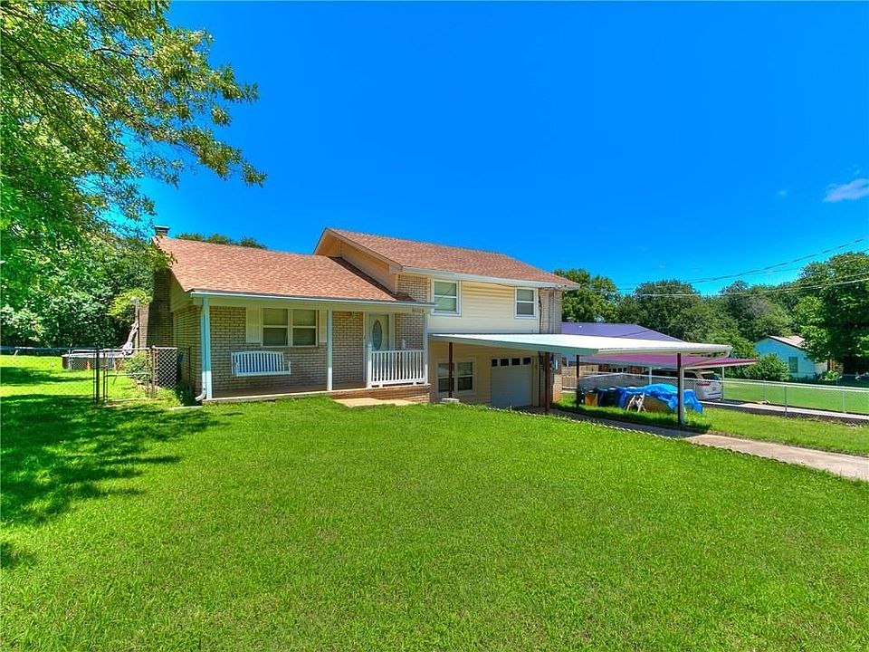 Peaceful, country, tri-level retreat on .81 acres within Choctaw School district with 3 beds, 1 bath, fireplace, office, large laundry room and screened-in back porch. Kitchen, dining and living on main level, office & laundry on ground level, all three bedrooms and bathroom on the upper level. RECENT UPGRADES INCLUDE HEAT PUMP, ROOF, HOT WATER TANK, SIDING, WELL PUMP and WINDOWS!!! There is a horse stall at the back of the property.