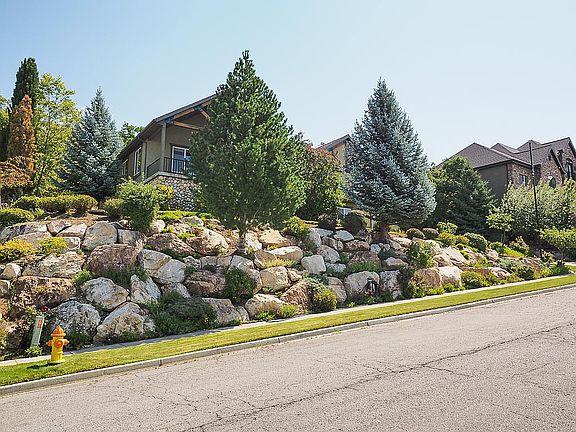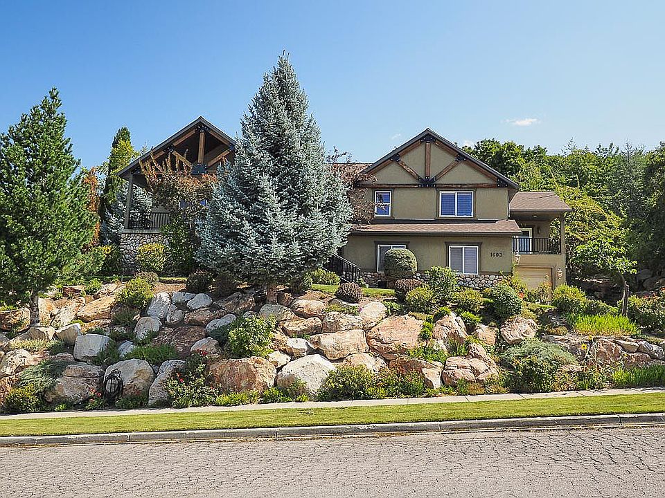 Custom home built into the side of the hill. Has full mother in laws apartment at ground level with full kitchen, pantry and laundry room. Three car garage and carpeted space for home gym. Main living upstairs has vaulted ceilings with beams for cabin-like feel. Gas fireplace with gorgeous floor to ceiling rock. Beautiful solid hardwood floors, tile and new high end carpet. Alder trim, doors and cabinets throughout. Gorgeous kitchens up and down with granite counters. Wood shutters throughout. Separate office, a sitting room off the master bedroom that could also be a second office. Covered patio off the sitting room with a view of the valley and mountains below. Large covered front porch with amazing view of valley and mountains. Brand new sealed driveway! New front steps. Radiant heat floor in downstairs. Large back up gas generator attached to home for all major appliances and other electrical needs. Large cold storage room. Huge water feature in back with three waterfalls and multiple ponds. Fruit trees! Top of property backs up to Bountiful Blvd with no back neighbors. Has curb cut at top of property to allow for building of sport court, pool, shop or second dwelling (approved by Bountiful City). Sprinkler system, water softener and reverse osmosis system in upstairs kitchen. Plus many more special touches!!