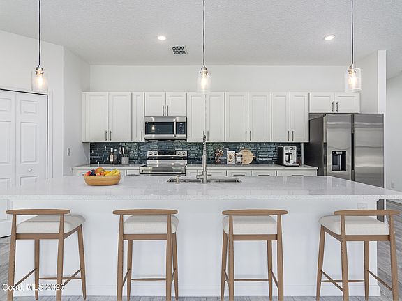 Ready Now! New home w/ HURRICANE IMPACT windows! Luxury vinyl flows throughout the home creating a modern fusion of comfort & class including all bdrms. Natural light bounces into a spacious living rm gracefully flowing into the roomy casual dining, & large kitchen w/ample storage & beautiful white cabinets w/ soft close doors & drawers accented by the sleek quartz counters, stylish backsplash, huge center island w/ light pendants & all stainless steel appliances. The sizable master suite is marked w/ granite counters, double sinks, a tiled shower & a large walk-in closet. The ensuite is perfect for guests or in-laws. The other 2 bdrms share the large guest bathroom. Outside, enjoy al fresco celebrations in the large trussed porch & backyard! Within 2 Min. to Bayside Lakes & Bayside High