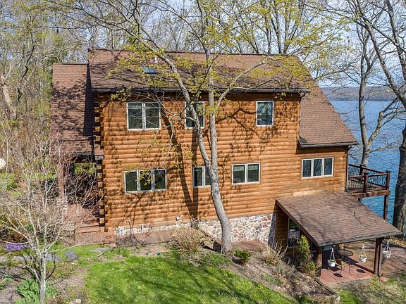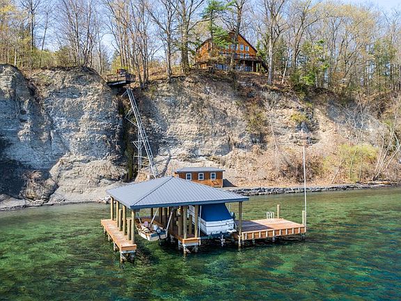 Beautiful lake house w/295 feet of lake frontage. Dramatic cathedral ceilings with a wall of windows to showcase spectacular views. Main level features hardwood floors, open floor plan w/gourmet kitchen open to the living room w/gas fireplace, a formal dining room, main level bedroom, full bath & flexible space w/built in bookcases that works perfectly as an in home office. Upstairs is the primary bedroom, large spa like bathroom, walk in closet & a loft overlooking the living room another perfect spot for an in home office. Lower level features another bedroom, full bath, family room & laundry room. Attention dog lovers! Access to fenced in area through the doggy door in the utility room, there's even a special bath area for washing your pups! Best feature of all is the lake! Head down using the elevator to access a large dock w/ 2 boatlifts and 1 for a jet ski a boathouse & lovely shale beach for easy water access. Excellent condition! 15 mins to Cornell/IC and many wineries.