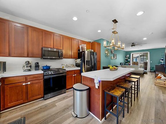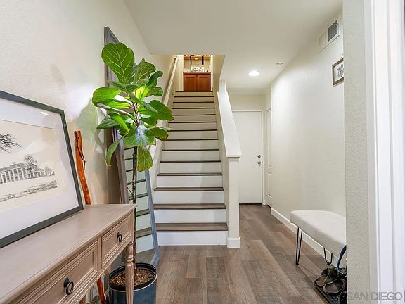 Introducing a captivating 3-bedroom, 3.5-bathroom tri-level townhouse style condominium in the heart of Eastlake, Chula Vista. This meticulously maintained residence is an ideal blend of modern elegance and functional design. As you enter, you'll be greeted by a thoughtfully designed first level featuring a spacious bedroom with an ensuite bathroom, providing privacy for guests or the perfect home office setup. The convenience of a 2-car garage adds an extra layer of practicality to your lifestyle. Ascend to the second level, where an open-concept living space unfolds. Hardwood floors and recessed lighting create an inviting atmosphere, while the well-appointed kitchen boasts an island with an elegant chandelier, seamlessly connecting to the living area featuring a cozy fireplace. Enjoy the convenience of a laundry closet and step onto the balcony to savor al fresco moments. The top level reveals two generously sized bedrooms, each with its own ensuite bathroom, offering a retreat-like experience. The entire layout exudes a sense of comfort and style, making this condo a perfect haven to call home. Beyond the confines of your residence, the condo complex has amenities, including a pool and spa, a BBQ area for entertaining, a playground. The surrounding community and discover the convenience of being minutes away from nearby trails, mountains, Lower Otay Lake, and numerous parks. Easy access to the 125 freeway ensures seamless connectivity, while Otay Ranch Town Center provides an array of shopping and dining options. Don't miss this opportunity to make this your own.