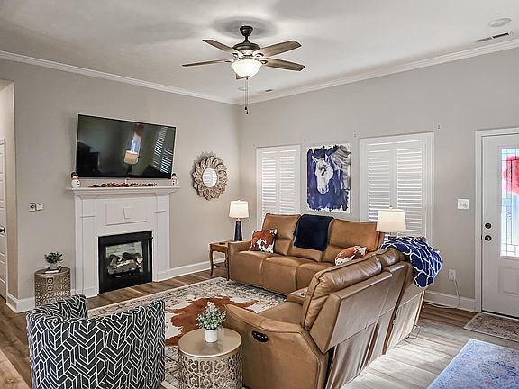 - Features: Ceiling Fan(s), Crown Molding, Fireplace